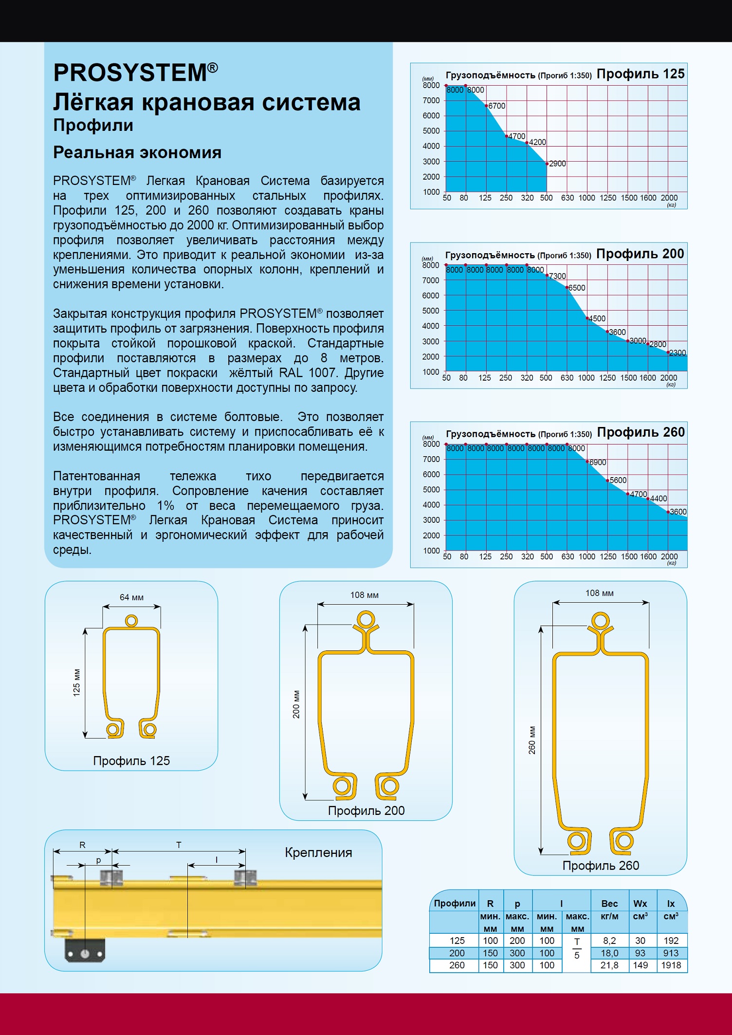 Легкая Крановая Система базируется на трех оптимизированных стальных профилях. Профили 125, 200 и 260 позволяют создавать краны грузоподъёмностью до 2000 кг. Оптимизированный выбор профиля позволяет увеличивать расстояния между креплениями. Это приводит к реальной экономии из-за уменьшения количества опорных колонн, креплений и снижения времени установки.